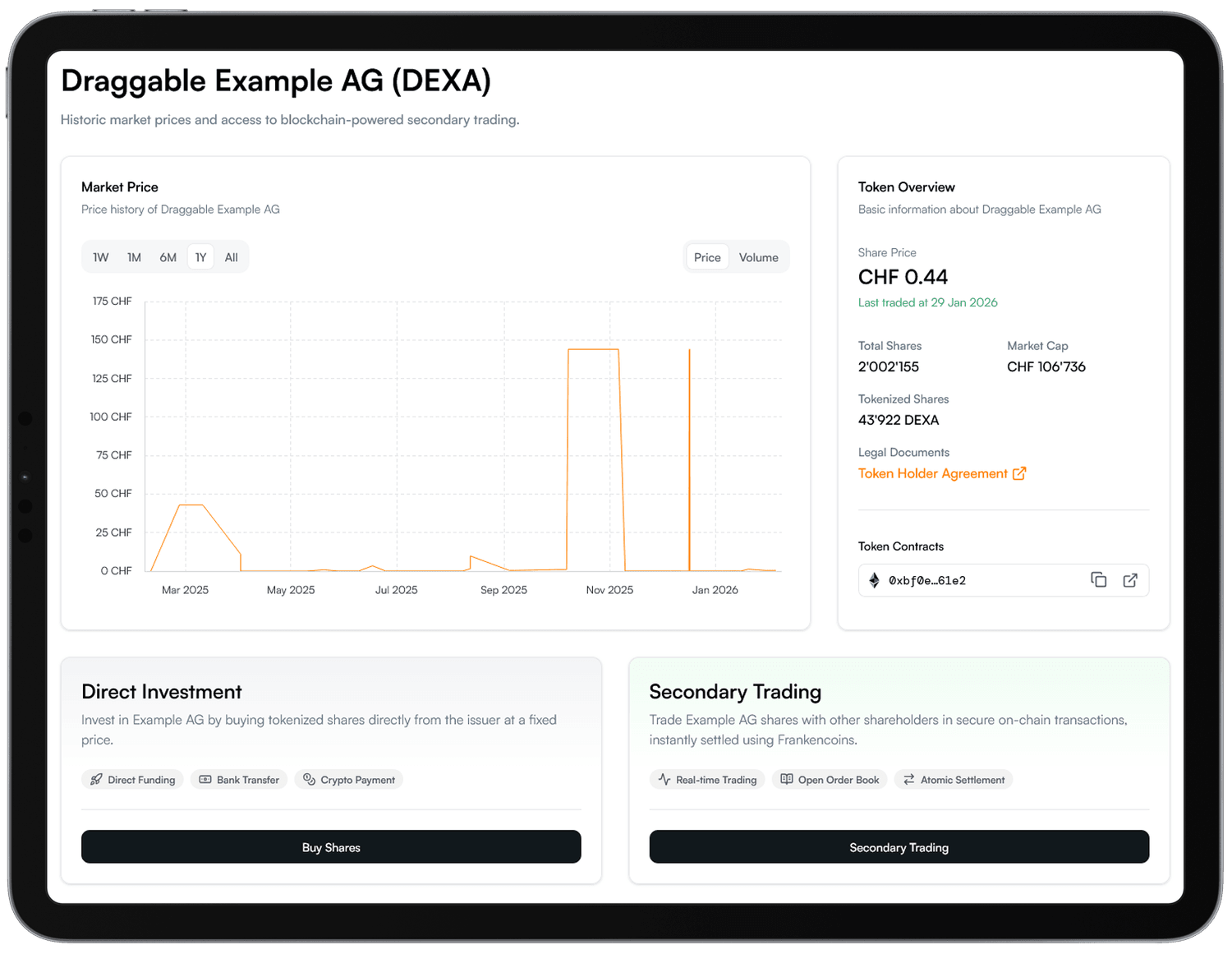 Enable order-book trading with transparent pricing and issuer-enforced transfer rules.