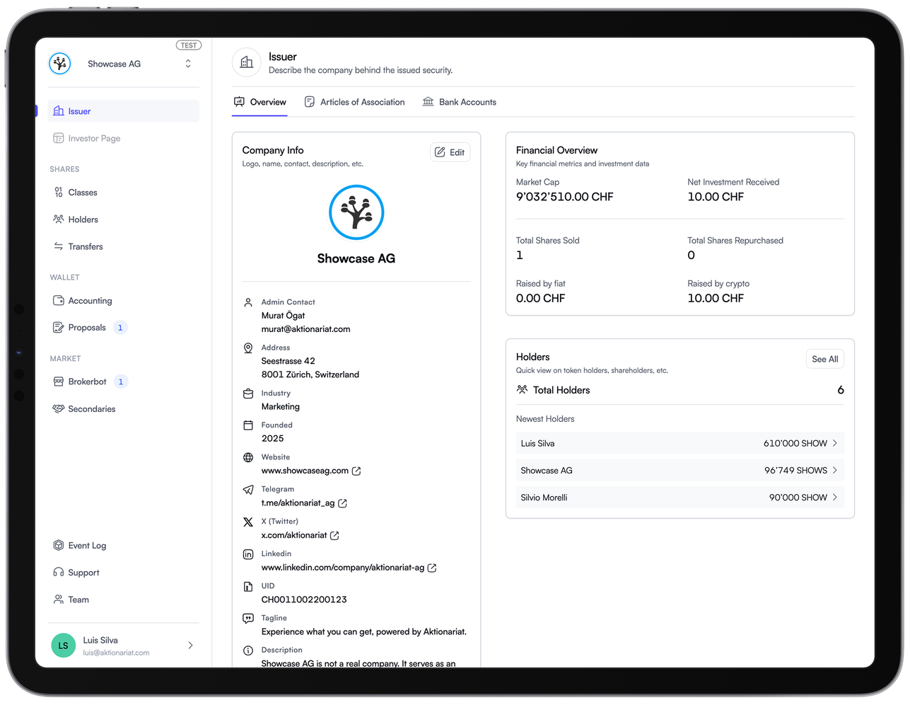 The Issuer Portal gives companies complete control over their cap table, tokenization, and compliance—all from one integrated dashboard. Replace spreadsheets and manual processes with automated shareholder management.