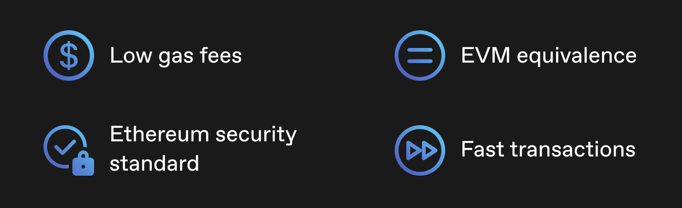 - Scaling solution: Optimism Layer-2 rollup as a means to reduce gas fees (transaction cost) and increase transaction speed (throughput).