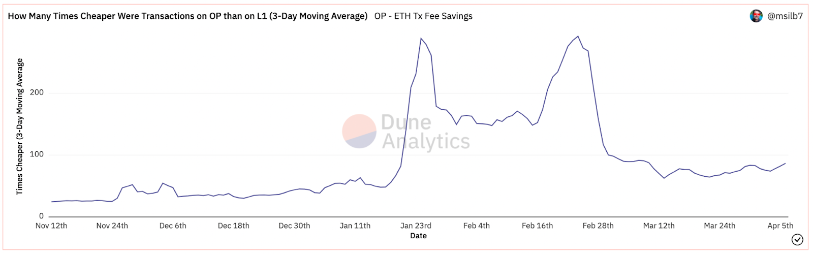 Optimism brings developer and end user-related benefits on at least four scores: Ethereum Virtual Machine (EVM) equivalence, security, speed, and costs. Figure 1 depicts visually. First, Optimism supports any Ethereum application through its Optimistic Virtual Machine (OVM). This feature allows dApps built on Ethereum to be ported with little to no architectural changes to Optimism. Second, unlike sidechains, Optimistic rollups derive their security from the Ethereum mainnet. While transactions are processed on Optimism, the data is written and stored on the main network. Through this feature, Optimism inherits the security advantages of the Ethereum blockchain while enabling scalability. Third, Ethereum's transaction capacity currently hovers at around 10 transactions per second (TPS). Optimism can achieve up to 10-100x improvements in scalability in comparison. Finally, gas fees on the Optimism network are significantly lower than on the Ethereum mainnet. Figure 2 shows how many times cheaper transactions were on Optimism as compared to Ethereum in the past five months. The data implies that savings in transaction costs when using Optimism are especially high when demand for the Ethereum network (i.e., gas fees) peaks.